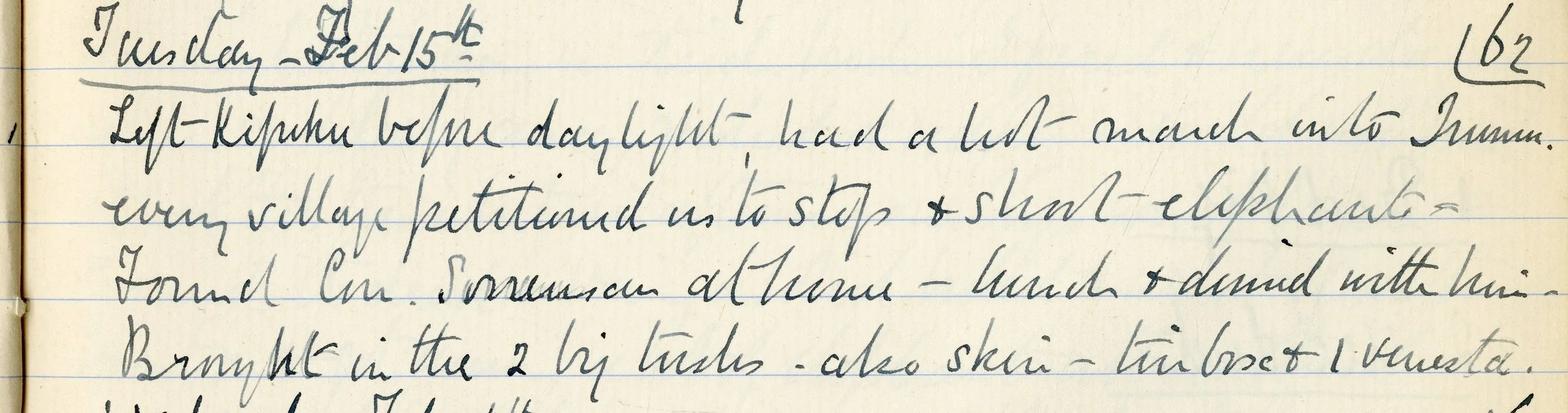 Left Kifuku before daylight. Had a hot march into Irum. Every village petitioned us to stop & shoot elephant. Found Com. Sorensen at home - lunch and dined with him. Brought in the 2 big tusks, also skin, tin box and one venesta.