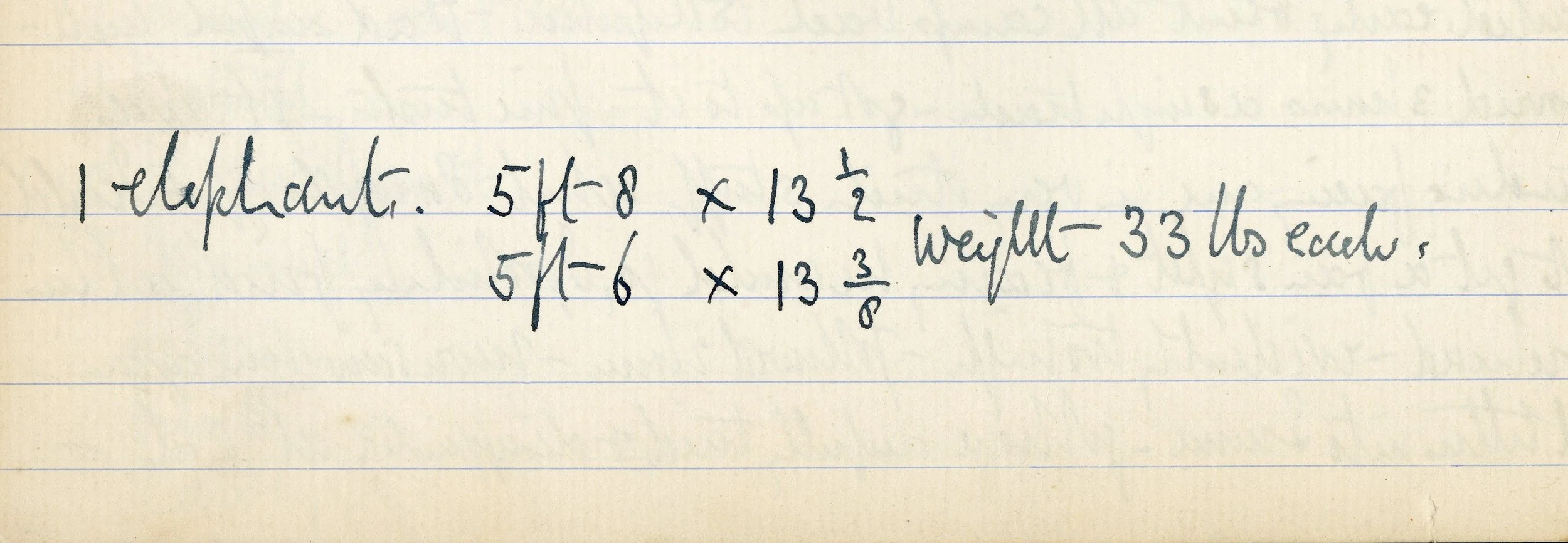 1 elephant. 5ft.8in. x 13 ½) Weight 33 lbs. each.