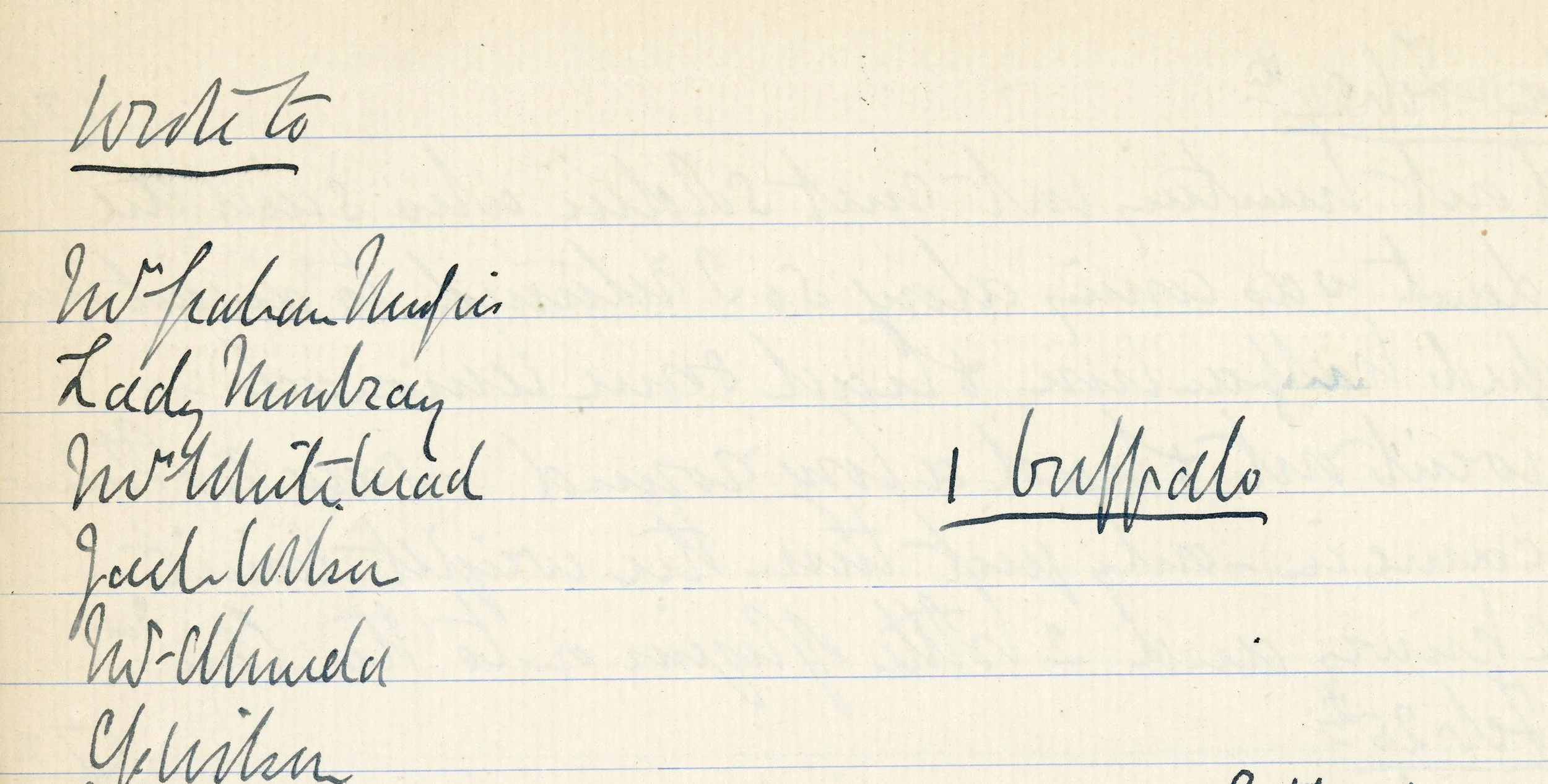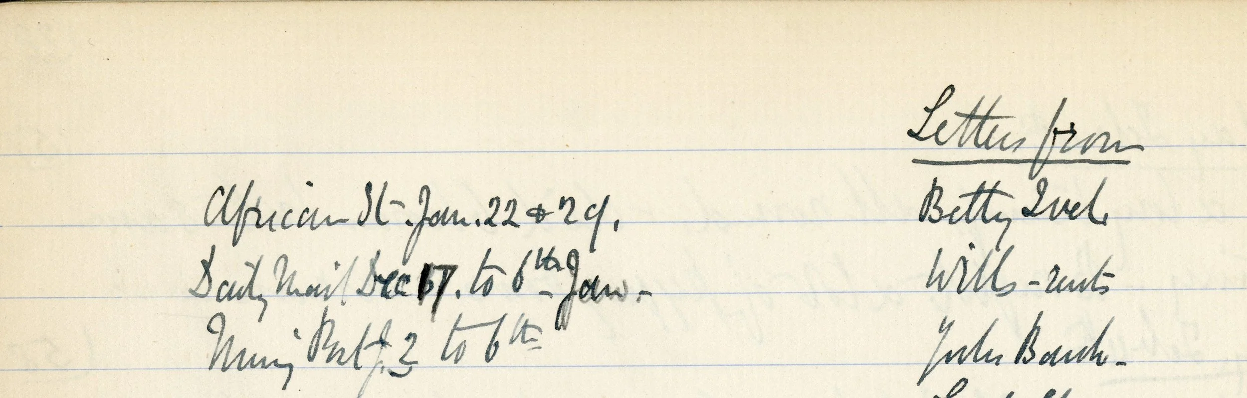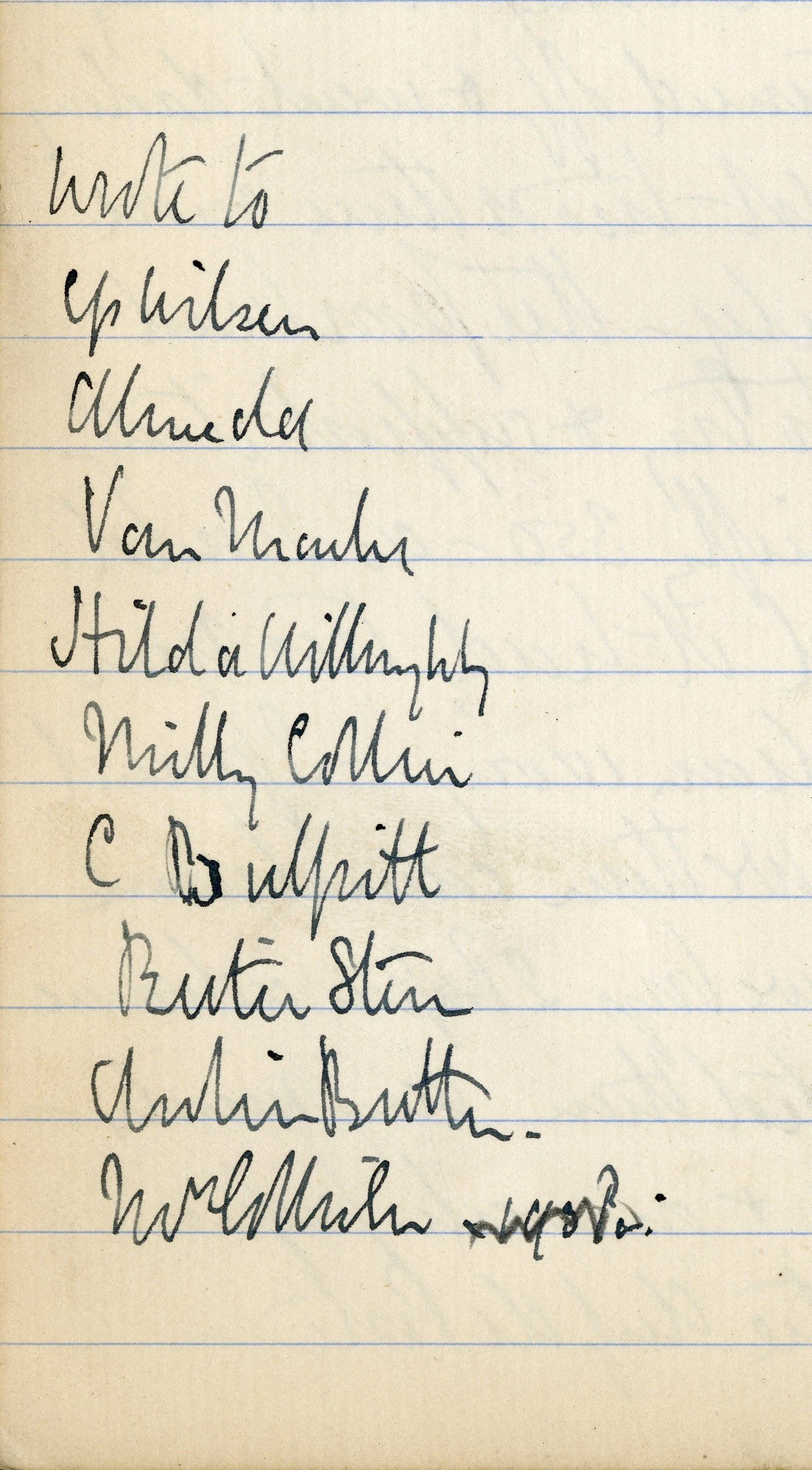 Wrote to: Cp. Wilson. Almeda. Van Marcke. Hilda Willoughby. Milly Collin. C. Bulpitt. Bertie Stern. Archie Butler. Mrs. Colliston.