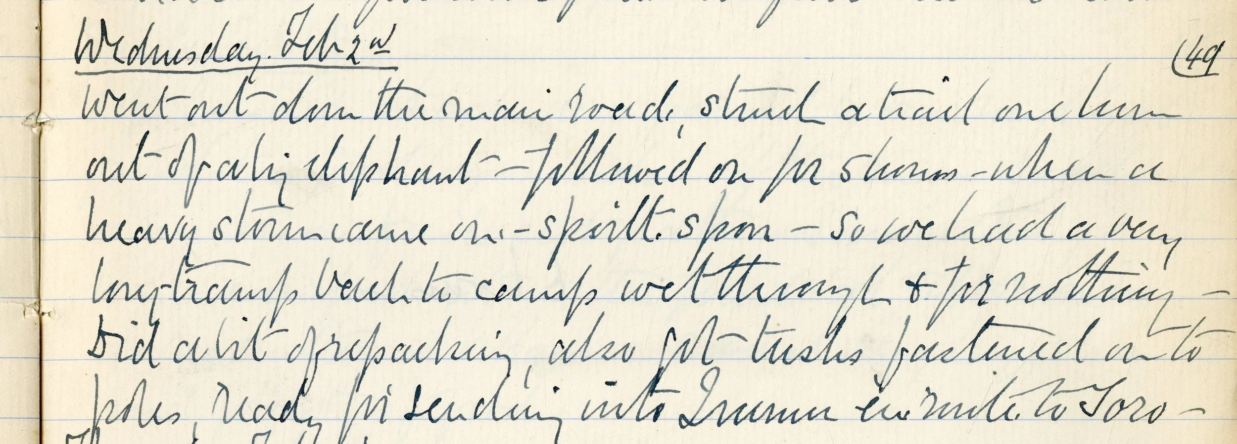 Started away at daylight - saw several fresh spoors - just after resting about half way, I had started off again, boys all talking & porters close on to us, when suddenly an appalling crash took place - at first I thought it was a tree, but the noise went on and then I said elephant. By this time we could hear it quite plainly. I seized a rifle and ran along the path, and 50 yards in saw him feeding. Going in alone I saw splendid tusks and quickly shot him. Best one this trip - 110 lbs. each. I took a lot of photos and we camped near all day. Got tusks out - weighed and cleaned. Loaded boys up with meat. Was pitch dark when we got home. Had a long day. Found runner in with letters and papers.