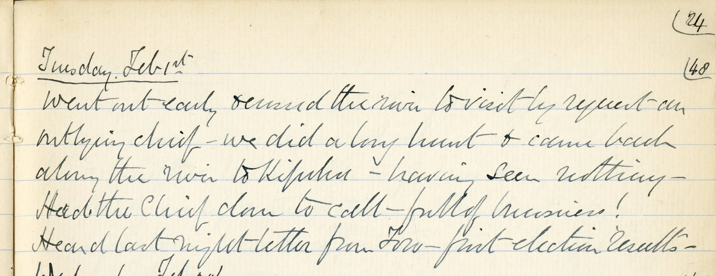 Went out early and crossed the river to visit by request an outlying chief. We did a long hunt and came back along the river to Kifuka, having seen nothing. Had the Chief down to call - full of business! Heard last night letter from Toro - first election results.