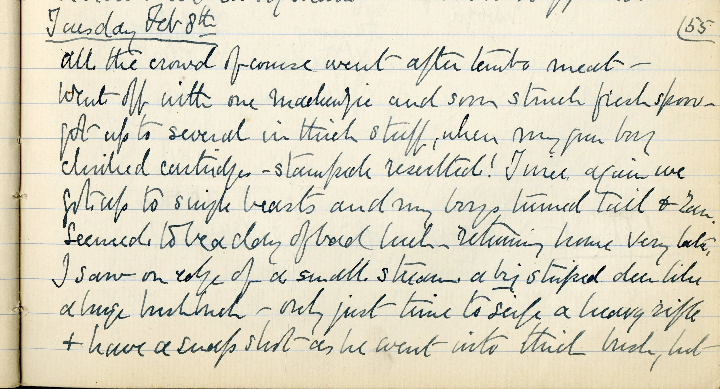 Moved out about 2 hours towards Cambi and took camp and food with 20 boys - left them to fix up camp, and we went off to hunt with two Mackenzie guides. Only just got well started when our guide said buffalo. I ran forward and saw a bit of a red skinned animal standing in thick bush. I fired and heard a groan, when suddenly away rushed a red pig. Could not find it at the time but in afternoon our boys went back and found it dead - being a solid bullet went clean through. Went on and got among a lot of elephant all scattered. Made a dreadful bungle in some thick stuff and shot a cow stone dead. Rushed away so that our guides never saw. Coming home we kept running into elephant on all sides, and unfortunately one charged down on Gimgoga and myself, and I only shot her 3 feet off me. A lucky escape but cruel luck.