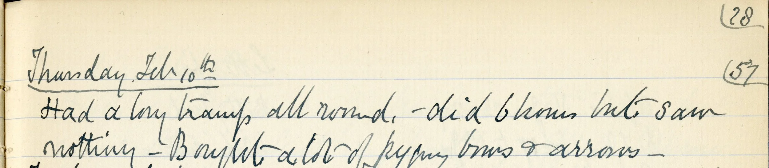 Had a long tramp all round - did 6 hours but saw nothing. Bought a lot of Pygmy bows and arrows.
