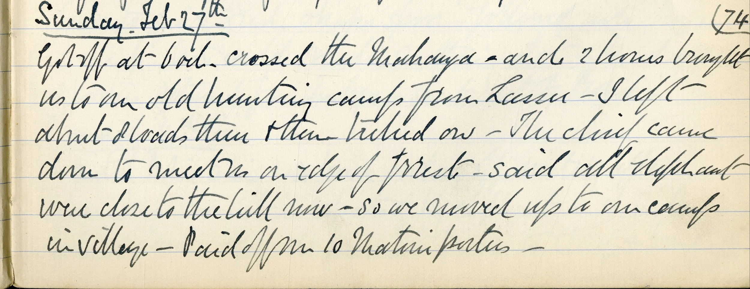 Got off at 6 o'clock. crossed the Mahanga, and 2 hours brought us to an old hunting camp from Lassu. I left about 8 loads there and then treked on. The chief came down to meet us on edge of forest - said all elephant were close to the hill now, so we moved up to our camp in village. Paid off our 10 Matoni porters.