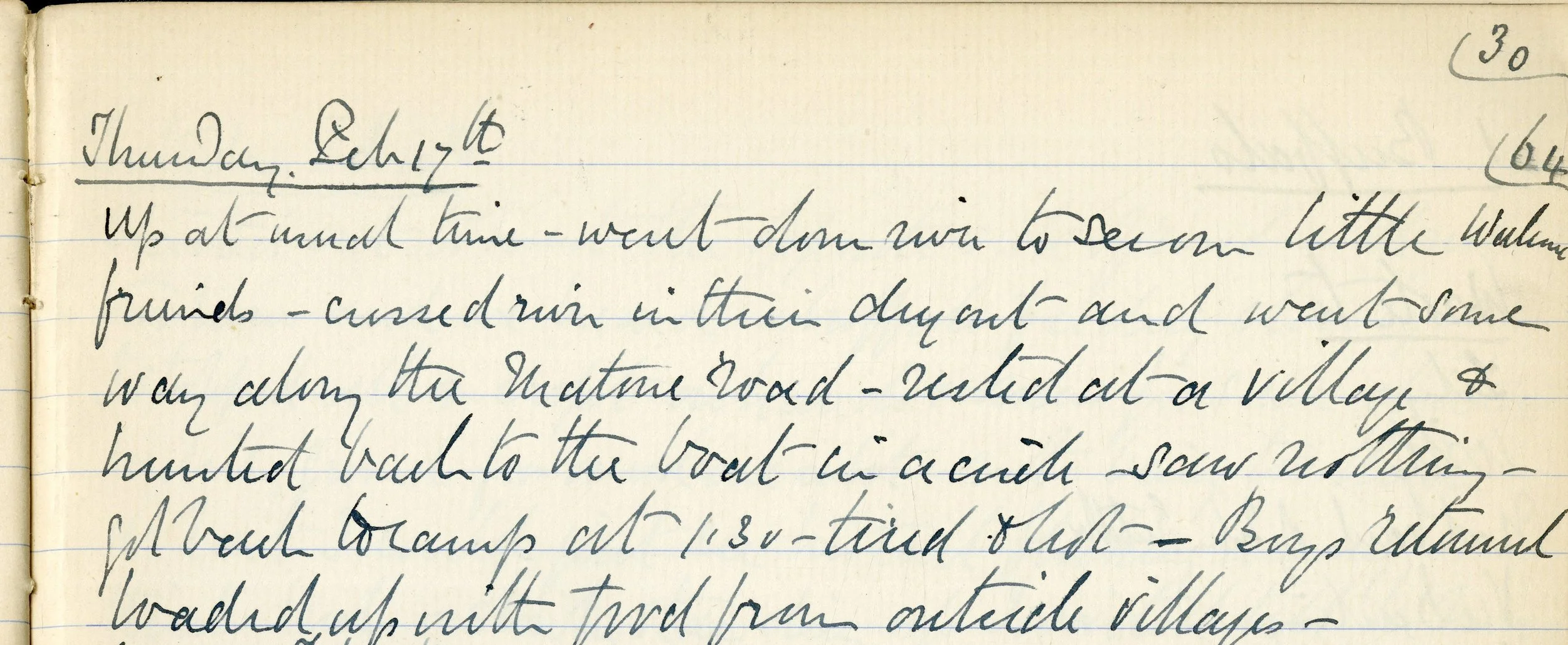 Up at usual time. Went down river to see our little Walesse friends. Crossed river in their dugout and went some way along the Matone road. Rested at a village and hunted back to the boat in a circle. Saw nothing. Got back to camp at 1.30 - tired and hot. Boys returned loaded up with food from outside villages.