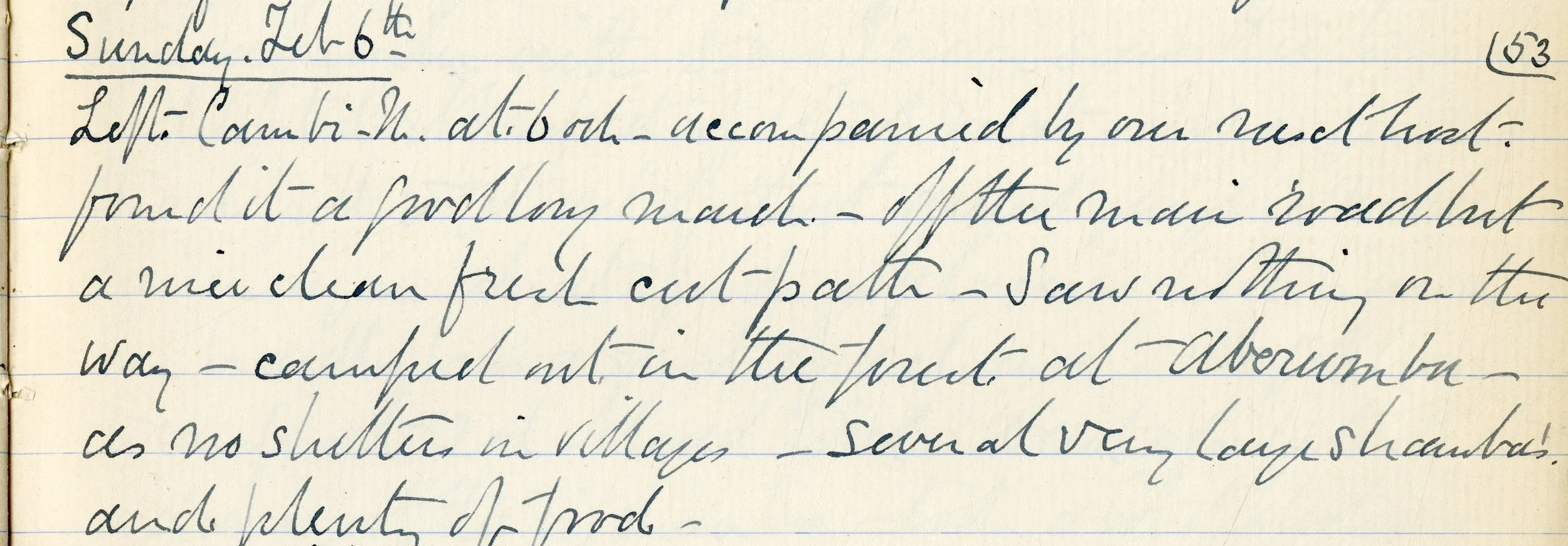 Left Cambi-M. at 6 o'clock accompanied by our next host. Found it a good long march, off the main road but a nice clean fresh cut path. Saw nothing on the way - camped out in the forest at Aberumba as no shelters in villages. Several very large shambar, and plenty of food.