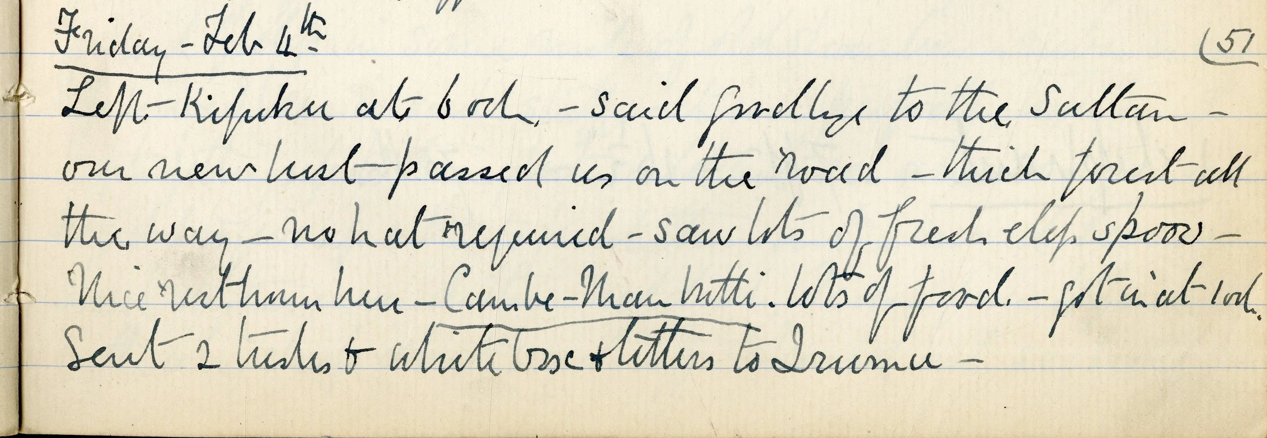 Left Kifuka at 6 o'clock - said goodbye to the Sultan - our new host passed us on the road - thick forest all the way. No hat required. Saw lots of fresh elephant spoor. Nice rest house here - Cambi-Mambutti. Lots of food. Got in at one o'clock. Sent 2 tusks and white box and letters to Irumu.